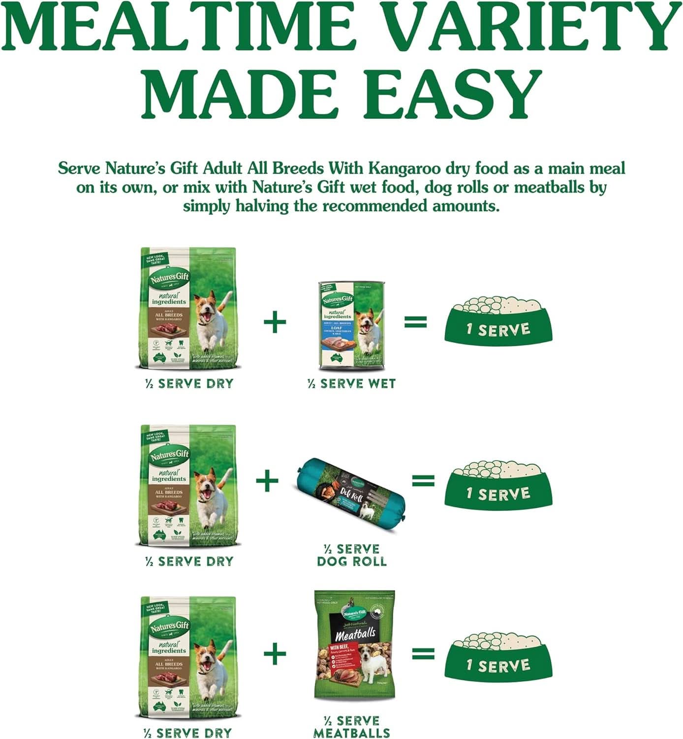Nature's Gift with Kangaroo Adult Dry Dog Food is a dry dog food made with kangaroo meat as the main ingredient. It is also enriched with vitamins, minerals and other nutrients to help keep your dog healthy and strong. The food is free of artificial colors, flavors and preservatives, so you can be sure your dog is getting a healthy meal.
